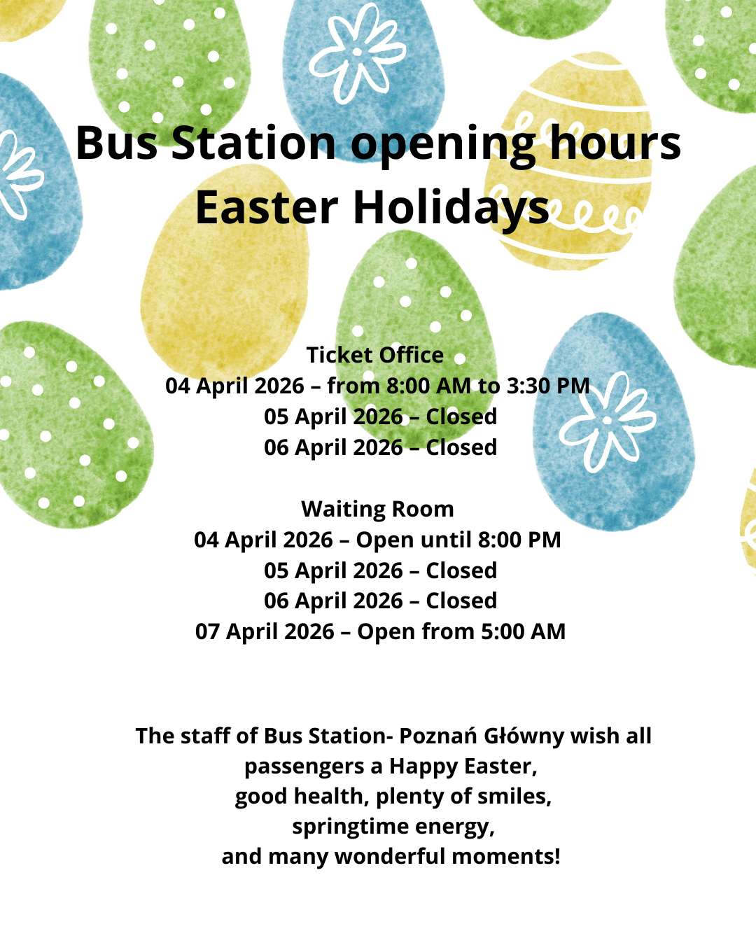 For all Passengers, we provide information about the holiday opening hours of the Bus Station Poznań Główny waiting room, ticket offices and the Passenger Informati...